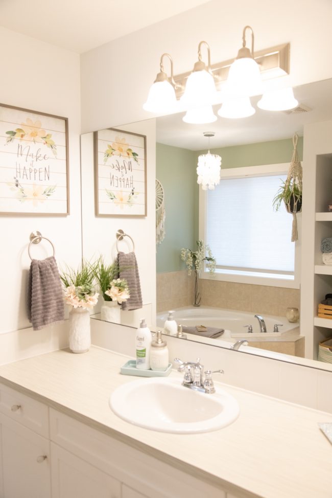 I did it again and forgot to get before pictures! Let me paint you a visual picture however. Previously this bathroom had a light minty green throughout the space on all the walls. It also have more wall decor above the tub, and different items on the shelves. This was a quick refresh which included:…